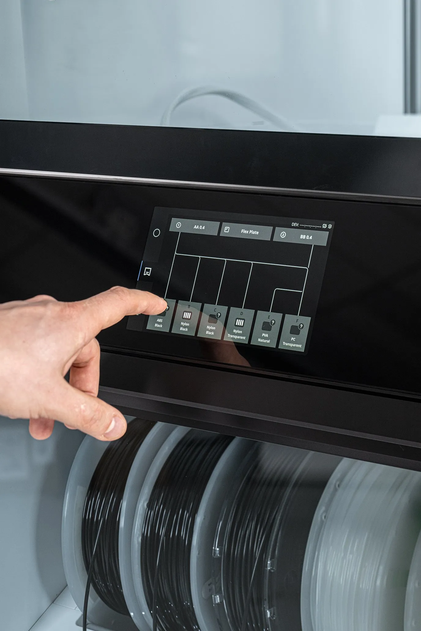 Новая, интегрированная, автоматическая система обработки материалов надежно управляет вашими катушками, так что вам не придется этого делать. Внутренняя камера поддерживается на уровне менее 10 % относительной влажности в офисных условиях, поэтому вы можете хранить до 6 килограммов нити в идеальном состоянии для последовательных заданий печати.