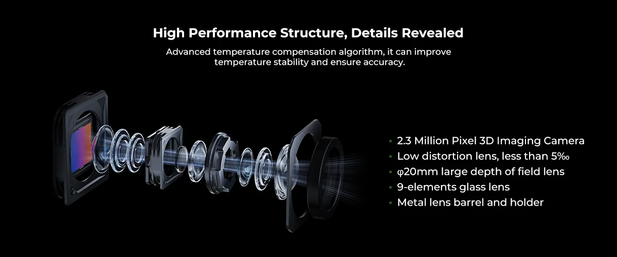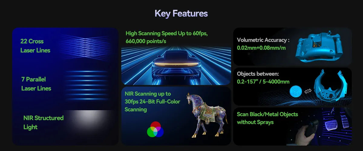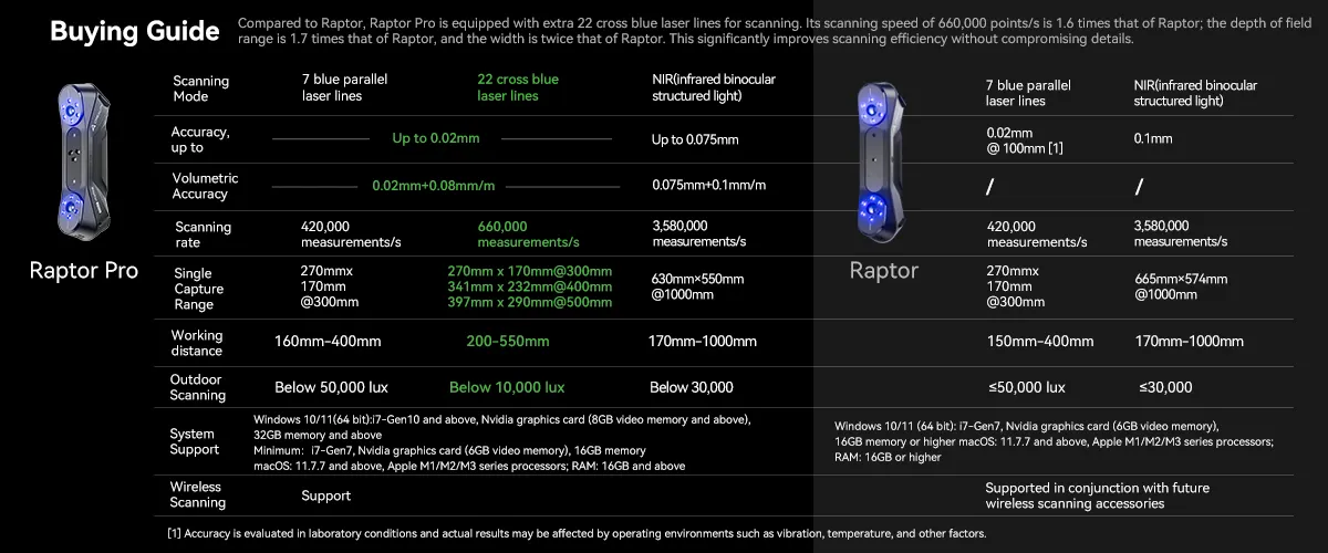 По сравнению с Raptor, Raptor Pro оснащен дополнительным 22 кресто-синим лазером или сканированием. Скорость сканирования в 660 000 пунктов/с в 1,6 раза выше, чем у Raptor. Глубина резкости в 1,7 раза больше, чем у Raptor, а ширина в два раза больше, чем у Raptor. Это значительно повышает эффективность сканирования без ущерба для деталей.