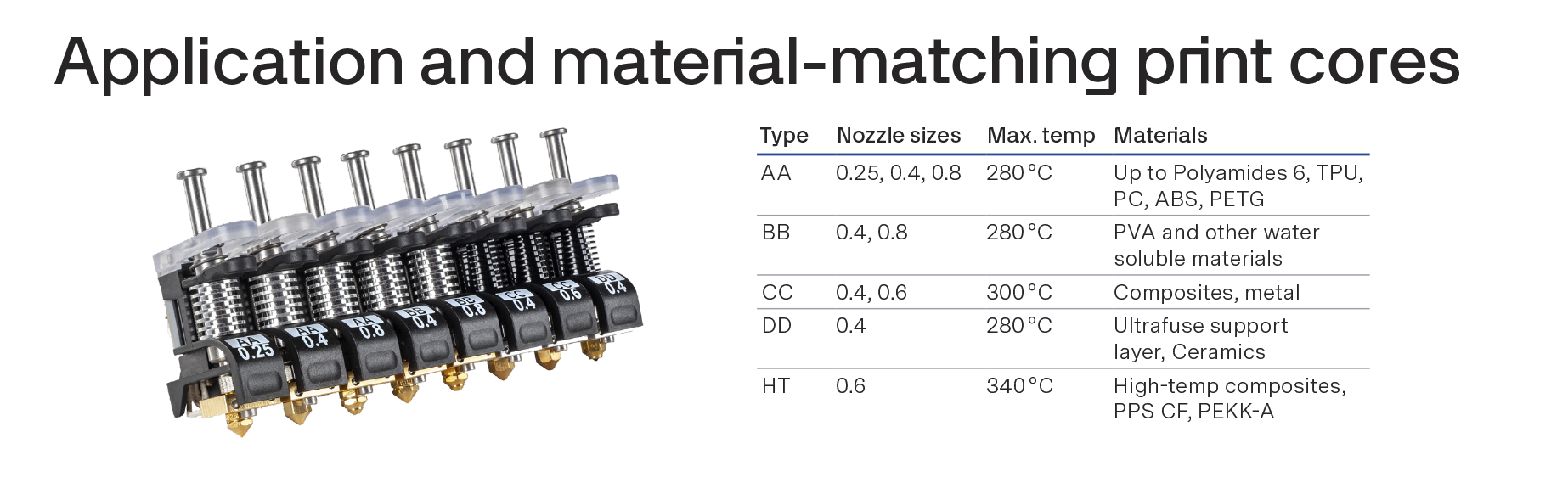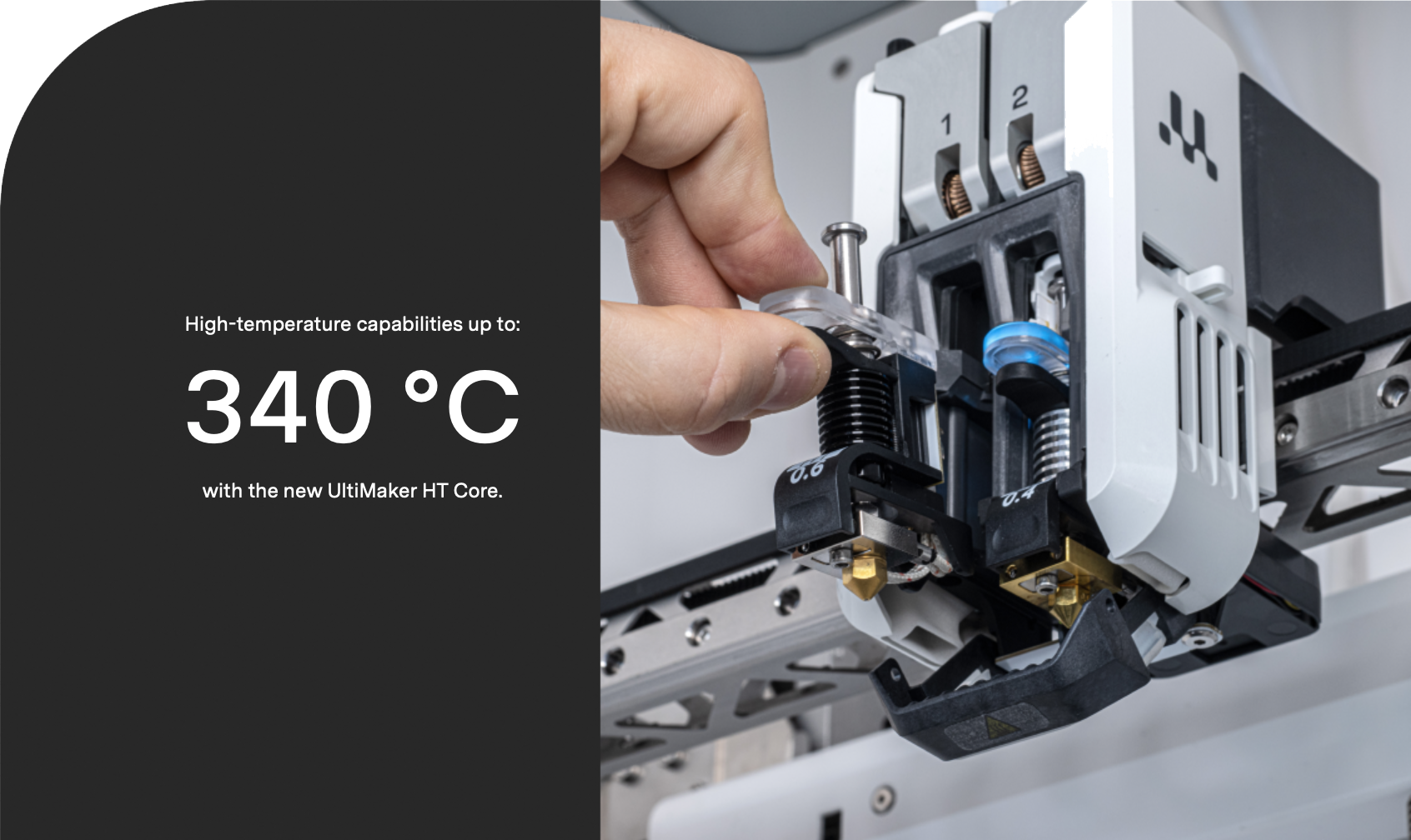 UltiMaker Factor 4 повышает температуру до 340°C, используя ядро печати HT, что позволяет печатать высокотемпературные и долговечные материалы с повышенной уверенностью.