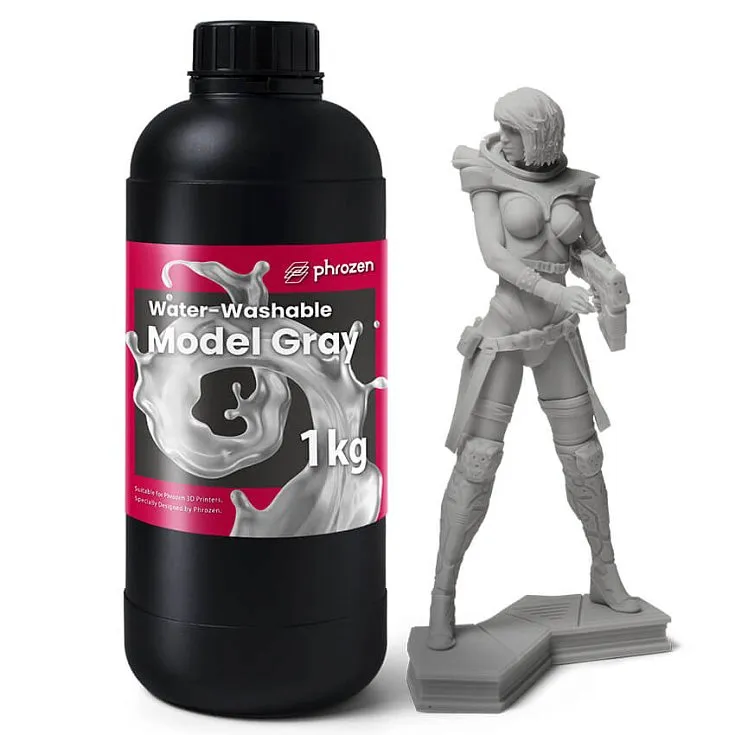 Смола Phrozen Water Washable Model Gray совместима со всеми 3D-принтерами с длинной волны 405 нм. Отсутствие усадки и деформации, быстрое затвердевание и долговечность позволяет быстро печатать прототипы или полноценные модели. Фотополимер не требует очистки спиртом (достаточно промыть водой) и не имеет запаха, поэтому подходит для использования дома.